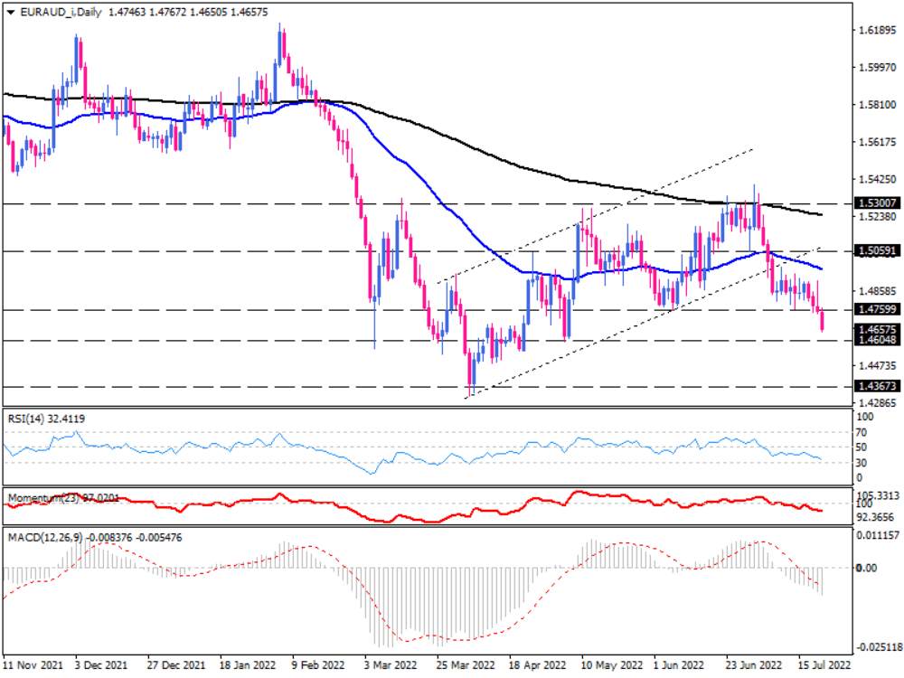 The EUR/AUD reaction was interesting among the other euro crosses. The euro initially rallied against the Australian dollar, as markets were only pricing in around a 50/50 chance of a 50bp hike. However, the euro quickly gave up all of its intraday gains and fell near ten-week lows at 1.47600 on the Australian dollar. Having broken below this barrier, Friday's trading moved further downward. If bearish sentiment persists, the price may keep falling towards 1.46048, the lowest level since early May.